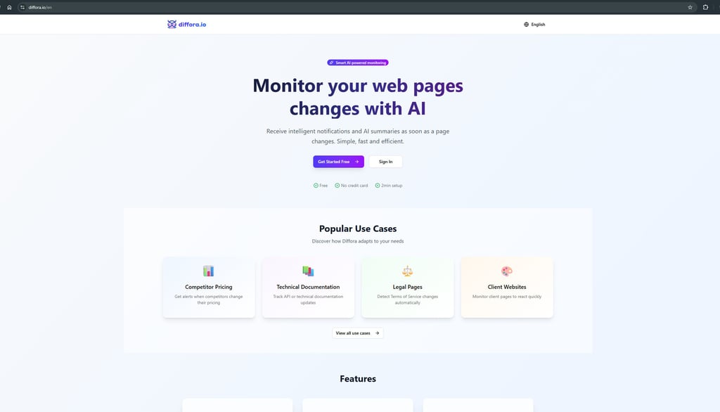diffora.io est l'un des seuls sites permettant de surveiller les changements effectués sur des pages web même difficilement accessibles en temps normal par les outils classiques de surveillance (JS lourd), et ce grâce à un algorithme à la pointe de la technologie.